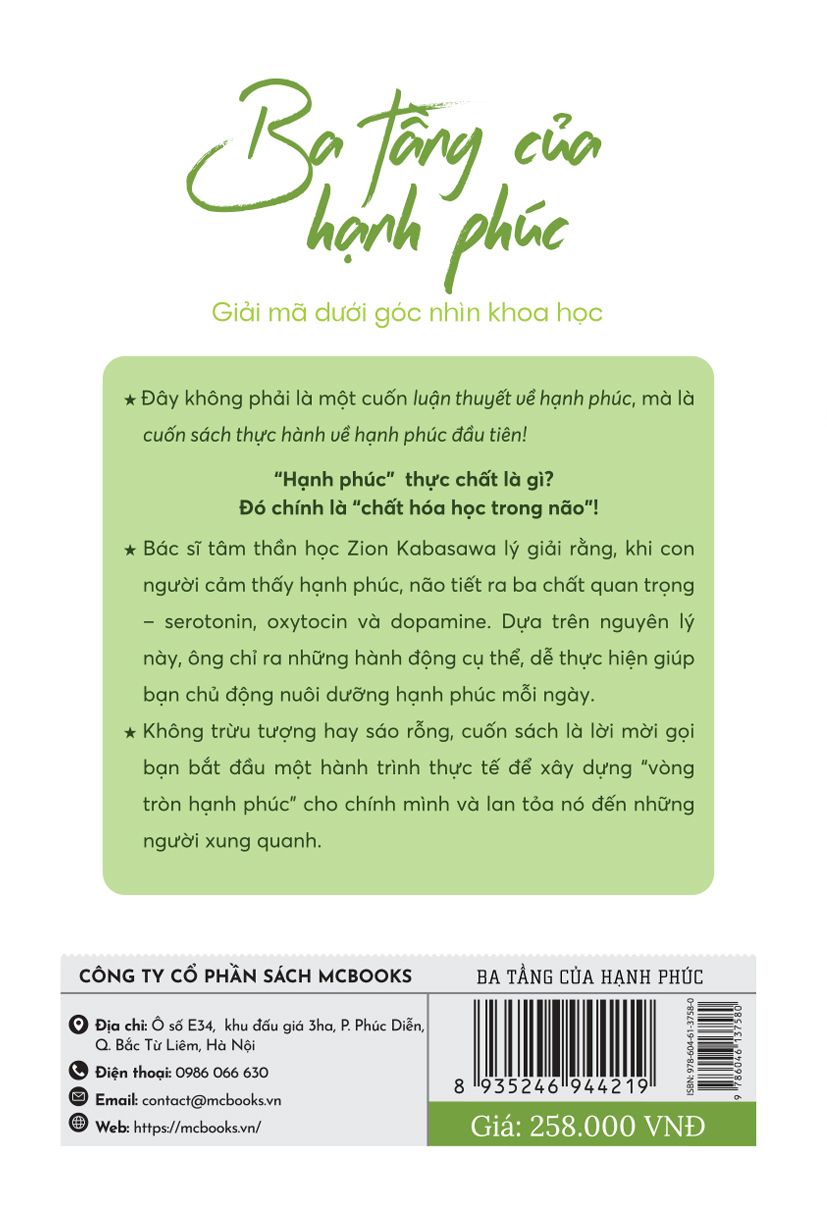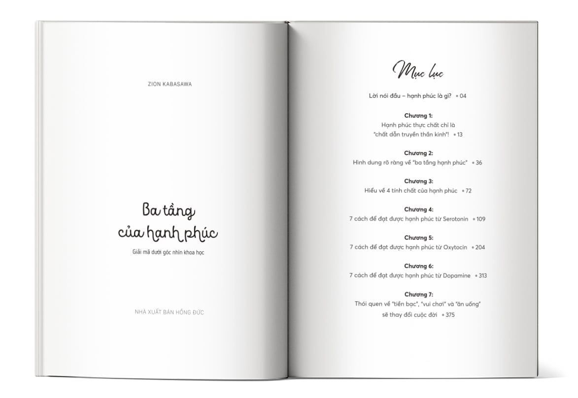 Trong cuốn “Ba tầng của hạnh phúc – Giải mã dưới góc nhìn khoa học”, bác sĩ tâm thần Zion Kabasawa đưa ra một cách tiếp cận hoàn toàn mới mẻ và khoa học. Thay vì những lý luận triết học mơ hồ, ông chỉ ra rằng hạnh phúc thực chất gắn liền với các chất dẫn truyền thần kinh trong não: serotonin, oxytocin và dopamine. Từ nền tảng này, tác giả cung cấp những “TO DO” – hành động cụ thể, dễ áp dụng để mỗi người có thể tự chủ động nuôi dưỡng và duy trì hạnh phúc cho chính mình.