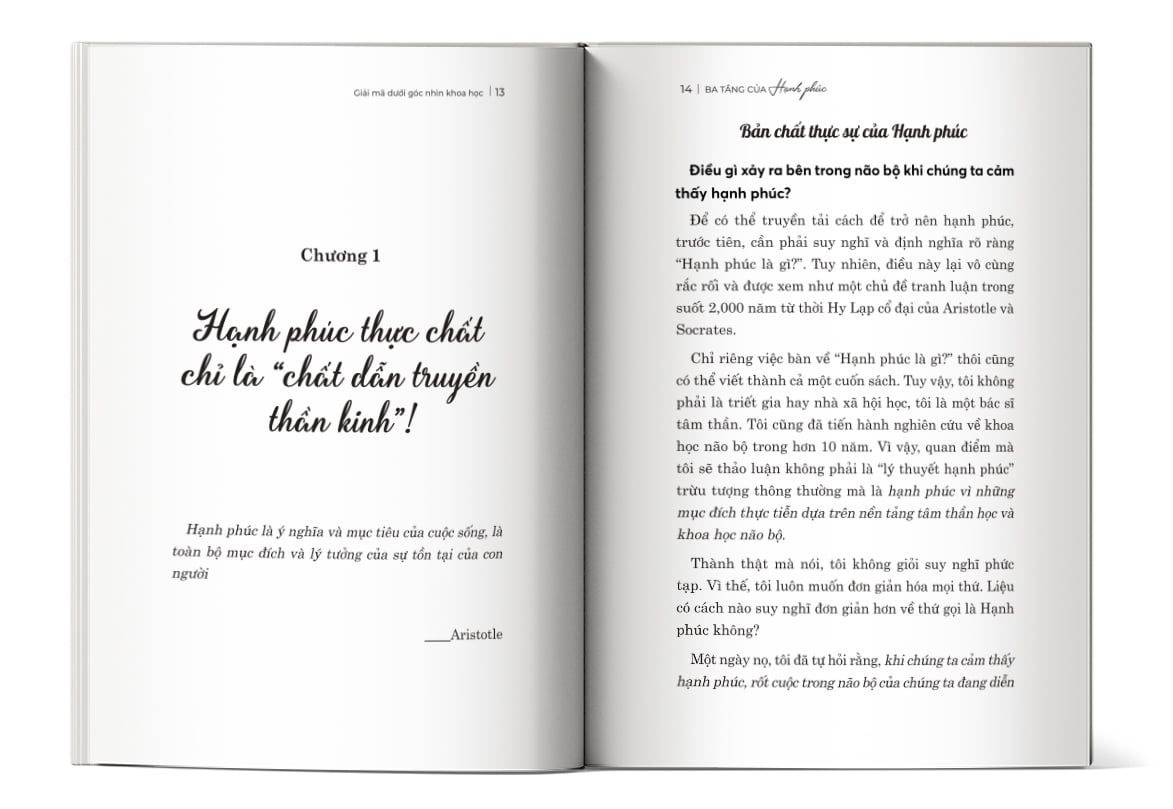 Tác giả lý giải hạnh phúc dưới góc độ khoa học thần kinh, gắn liền với hoạt động của serotonin, oxytocin và dopamine – ba yếu tố hình thành nên “ba tầng hạnh phúc”.