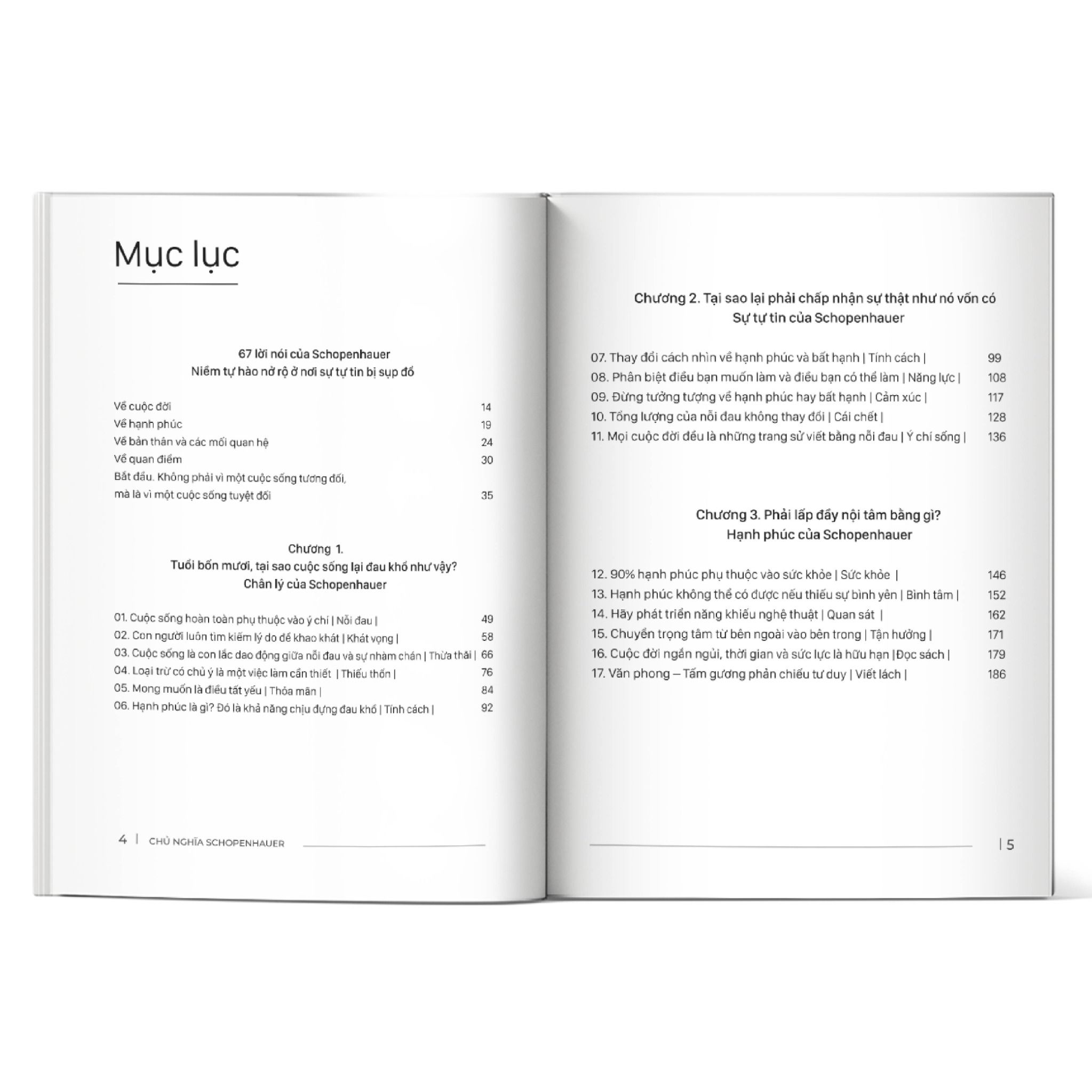 🛎 Chương 2: Tại sao lại phải chấp nhận sự thật như nó vốn có? Sự tự tin của Schopenhauer: Tập trung vào việc thay đổi góc nhìn và xây dựng sự tự tin nội tại. Các chủ đề bao gồm: nhìn nhận lại "Hạnh phúc và bất hạnh", phân biệt giữa điều muốn làm và có thể làm ("Năng lực"), không ảo tưởng về "Cảm xúc", hiểu rằng tổng lượng "Nỗi đau" không đổi, đối mặt với "Cái chết" và chấp nhận "Ý chí sống" biểu hiện qua những trang sử đau khổ của mỗi cuộc đời.