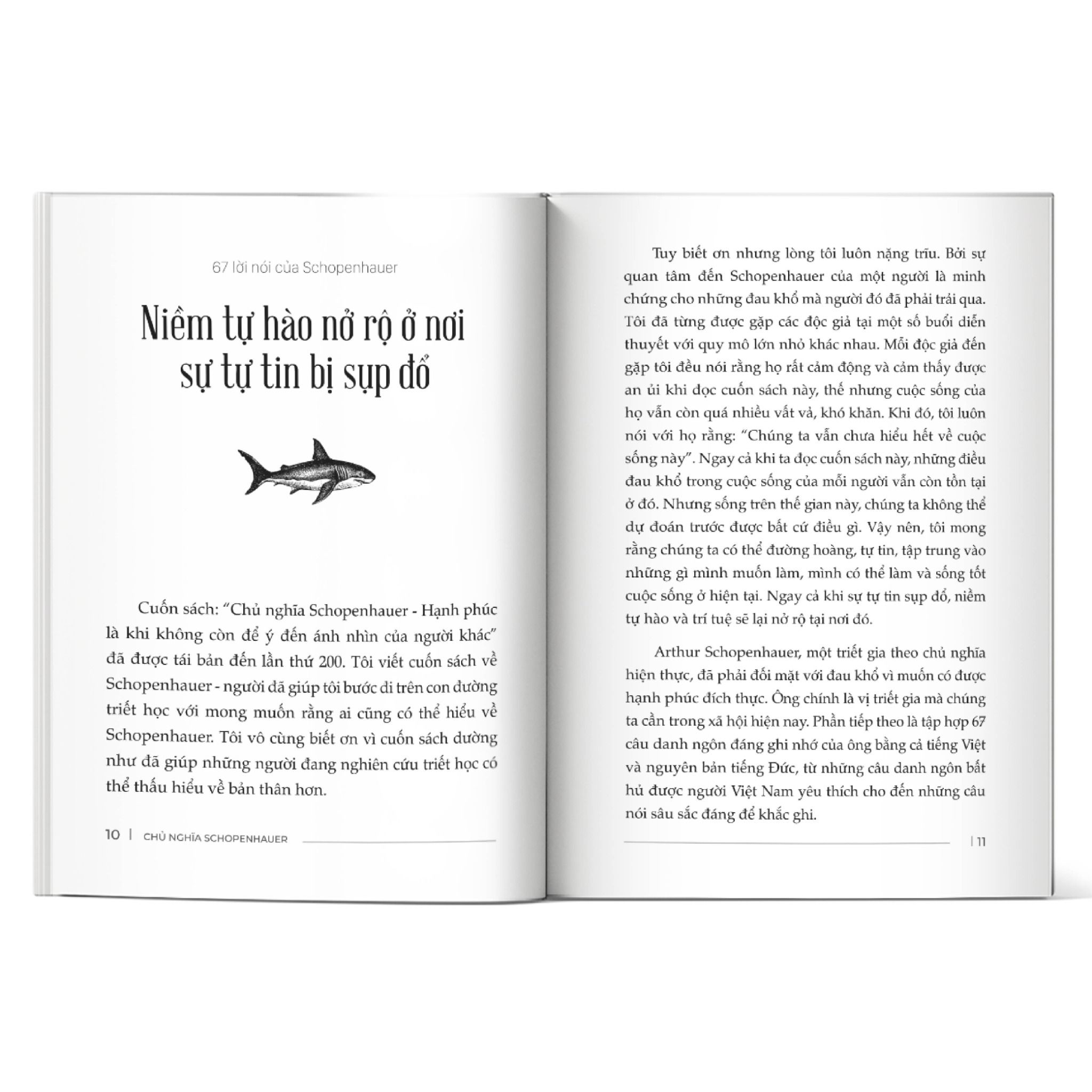 Lời tựa của tác giả Kang Yong Soo, chia sẻ về lý do ông viết cuốn sách, lòng biết ơn đối với độc giả và sự đồng cảm với những nỗi đau mà họ trải qua - điều thường dẫn dắt mọi người tìm đến Schopenhauer. Tác giả nhấn mạnh rằng dù đọc sách không làm nỗi đau biến mất, nhưng triết học của Schopenhauer có thể giúp chúng ta đối diện cuộc sống một cách tự tin hơn.